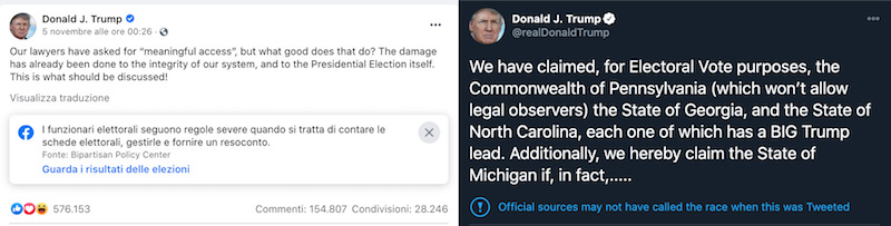 Una novità importante è stato l’attivismo crescente di piattaforme che oggi smettono di essere un veicolo passivo e si spingono a eliminare o contrassegnare i contenuti come fraudolenti, falsi o potenzialmente pericolosi. Sono state le elezioni in cui abbiamo visto giornalisti interrompere il Presidente uscente per segnalare che stava dicendo falsità; ma abbiamo anche visto Facebook e Twitter aggiungere delle precisazioni o delle note ai post di Trump contenenti affermazioni non provate.