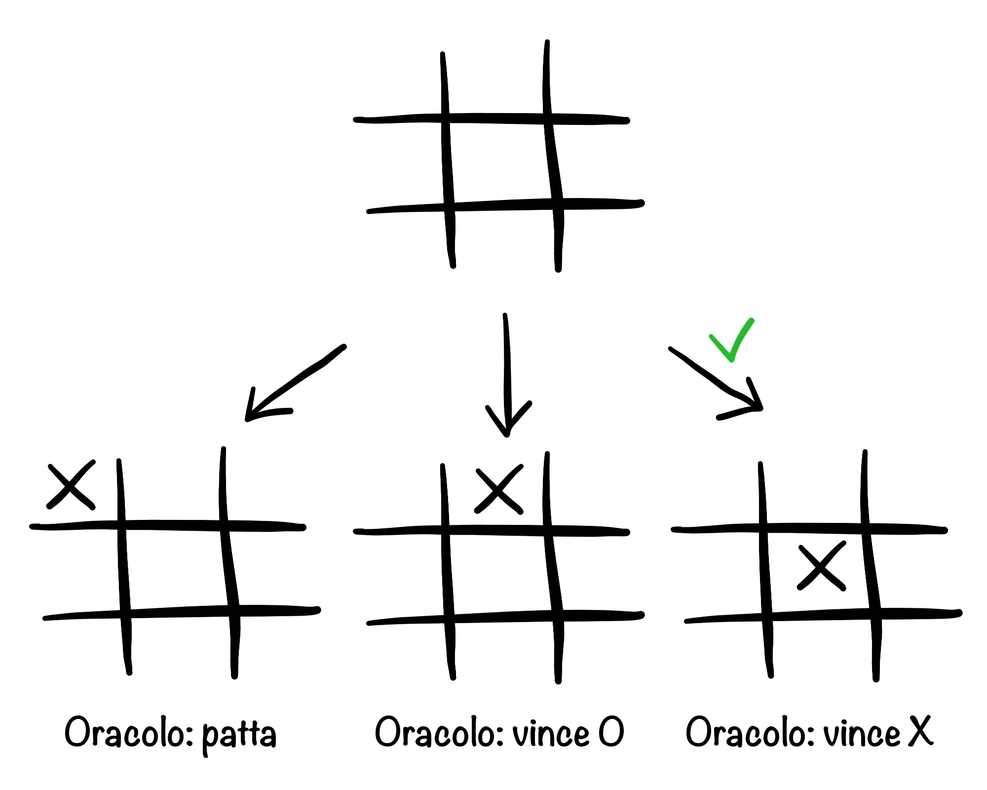 Per semplicità, pensiamo di dover fare la prima mossa a tris. Se avessimo un “oracolo” O1 che sa chi vincerà partendo da una qualsiasi posizione con una X, mi basterà provare ogni mossa e chiedere a O1 chi vince, e alla fine scegliere una qualsiasi di quelle vincenti, se esiste (spoiler alert: non esiste, sono tutte patte).