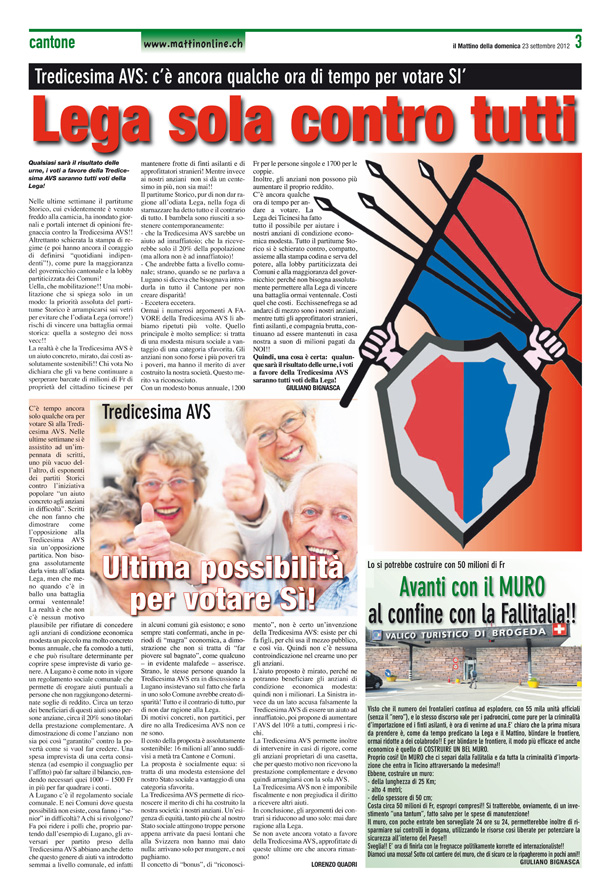 Giuliano Bignasca, a vederlo e a sentirlo parlare, è un tipo piuttosto folkloristico. Uno svizzero ticinese di 67 anni che quando parla ricorda Rezzonico e il poliziotto Huber di Aldo Giovanni e Giacomo. La rete è piena di suoi filmati, per chi volesse farsi una cultura. È anche uno che conta nella politica svizzera, Bignasca. Nel 1991 ha fondato la Lega dei Ticinesi, una specie di Lega Nord che sta oltre i confine, al di là di Varese. È un Bossi, non per niente ha fatto eleggere suo fratello Attilio e suo figlio Boris. La Lega dei Ticinesi, è il primo partito nel Canton Ticino e raggiunge il 13 per cento nelle elezioni federali. Prende voti con campagne pari-pari a quelle della Lega Nord. Vi ricordate i proclami contro gli extracomunitari del tipo “Affondiamo i gommoni”?. Ecco, Bignasca dice le stesse cose, ma contro gli italiani. Contro quella che lui chiama Fallitalia. Solo che lì, al confine di Brogeda, non ci arrivano i gommoni quindi l’idea di Bignasca e dei suoi, come racconta La provincia di Varese, è quella di fare un bel muro. È una proposta vera, la Lega e i suoi ci credono. Un bel muro a Brogeda “per bloccare i frontalieri con 55.000 unità ufficiali senza il nero”. E poi “bisogna farla finita con i padroncini, la criminalità d’importazione”. Recita il giornale della Lega dei Ticinesi, il Mattino della Domenica: “Un muro che ci separi da Fallitalia e da tutta la criminalità d’importazione”.