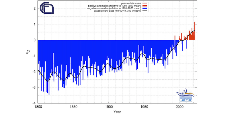Cioè da quando registriamo le temperature: rispetto all'ultimo trentennio la media annuale nazionale è stata più alta di 1,15 °C