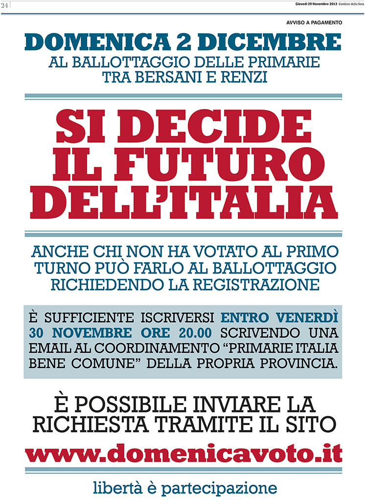 Oggi su Repubblica Gad Lerner e Oscar Farinetti spiegano perché al ballottaggio delle primarie del centrosinistra sceglieranno Bersani e Renzi, rispettivamente