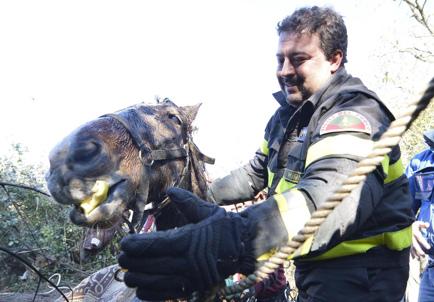Le foto del cavallo salvato oggi a Roma dai Vigili del Fuoco