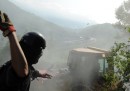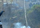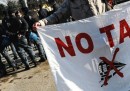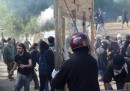Manifestanti, bandiere, tende, caschi, sedie e pietre: un sacco di pietre