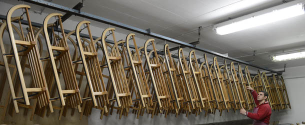 Le foto dell'assemblaggio di molti tipi di slittini in un piccolo paese della Germania