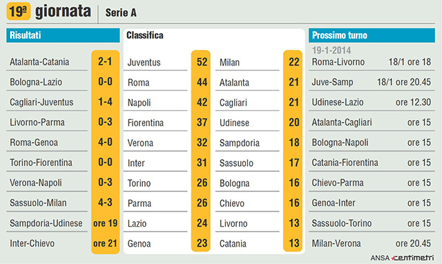 Risultati e classifica della 19esima giornata di Serie A