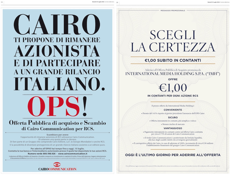 Ha presentato un'offerta pubblica di scambio sulle azioni della società editrice del Corriere della Sera