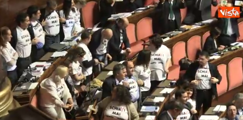 Bersani sorridente, Cicchitto assonnato e deputati del M5S con dei codici a barre sulla fronte, durante la discussione sul decreto lavoro