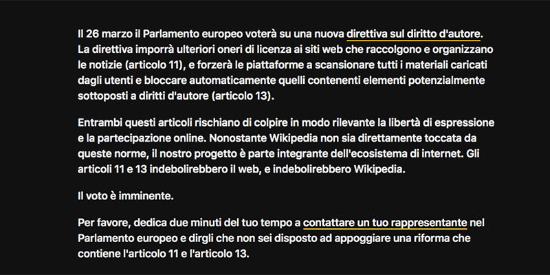 In Italia e per protesta, contro le nuove e controverse regole sul copyright su cui sta discutendo l’Unione Europea