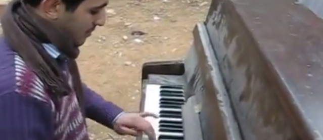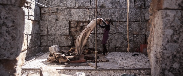 Dei ragazzi palestinesi hanno messo in piedi un'esibizione improvvisata, in mezzo agli edifici distrutti dalla guerra civile siriana