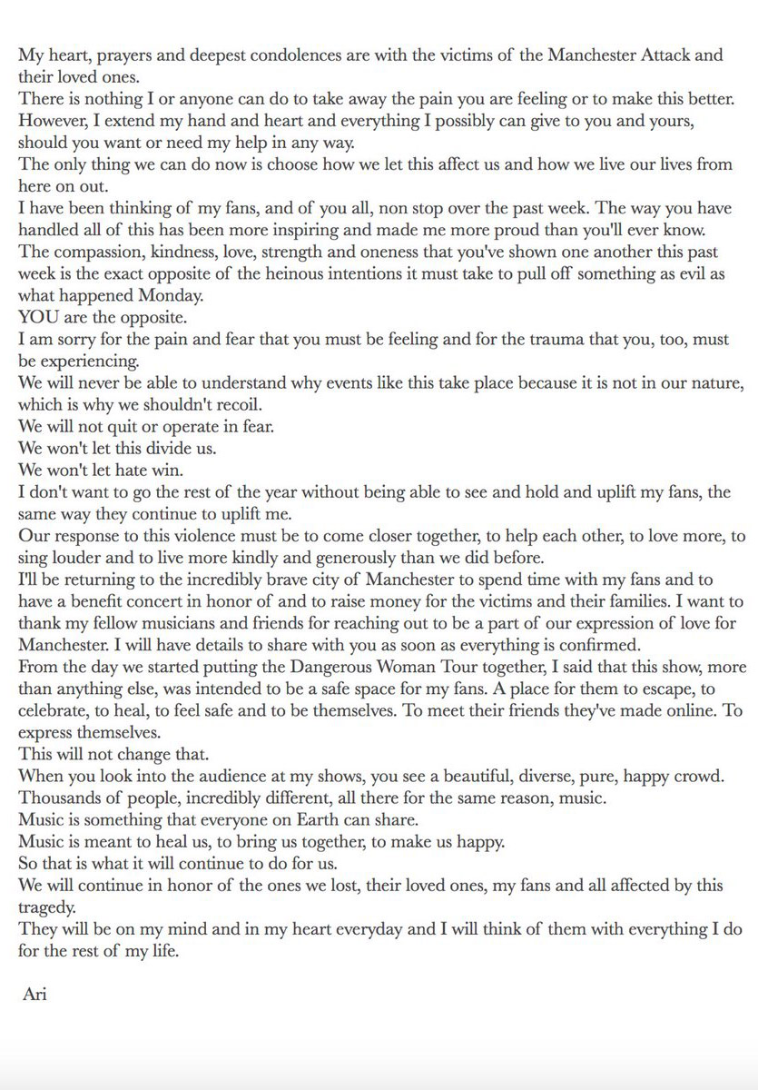 La cantate statunitense è andata a fare visita ad alcune sue fan ricoverate dopo l'attentato avvenuto il 22 maggio al termine del suo concerto