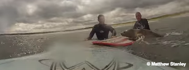 Matthew Stanley si stava riprendendo con la sua videocamera GoPro mentre faceva surf, quando un giovane esemplare di foca ha tentato insistentemente di salire sulla sua tavola e su quella del suo amico Andrew Flouders.