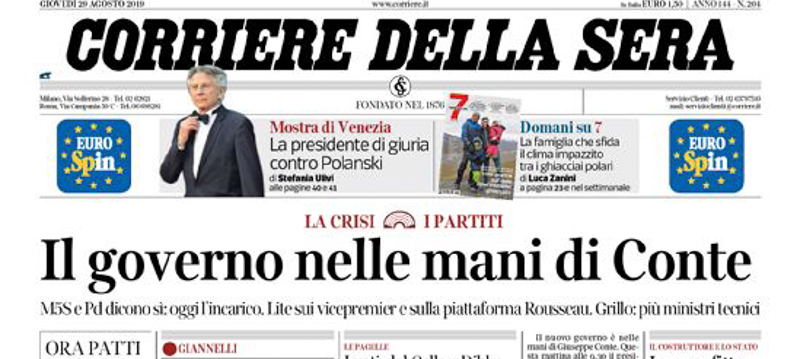 29/08/2019Le prime pagine di giovedì 29 agosto 2019Mattarella convoca Conte per dargli l'incarico, la sospensione del Parlamento britannico, l'eruzione di Stromboli