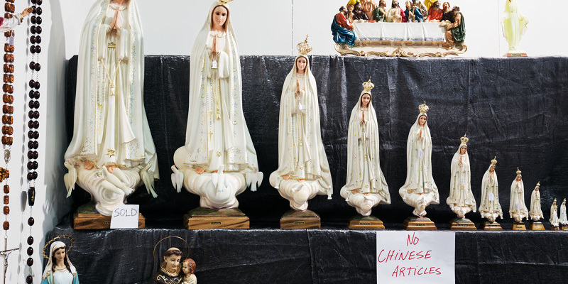 Madonne in ordine di grandezza, statuine di Gesù da appendere alle pareti e abiti da cerimonia, tra le altre cose fotografate da Louis De Belle alla fiera religiosa di Vicenza