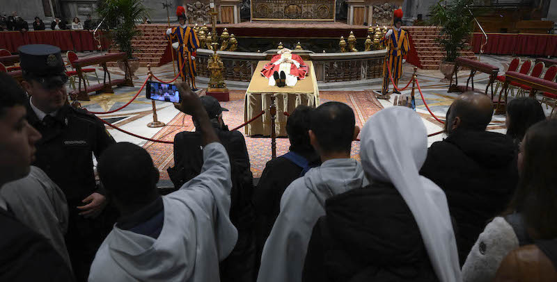 Migliaia di persone sono in coda per omaggiare il papa emerito: tra i primi ad arrivare ci sono stati Sergio Mattarella e Giorgia Meloni