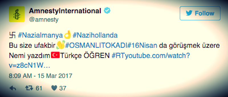 Nel giro di pochi minuti diversi account importanti hanno pubblicato lo stesso tweet in turco, che conteneva una svastica e un testo pro-Erdoğan