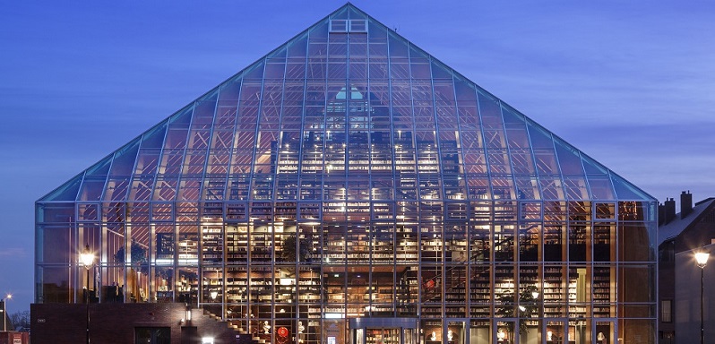 È una grande piramide trasparente con i libri visibili dall'esterno, progettata con materiale riciclabile e senza aria condizionata