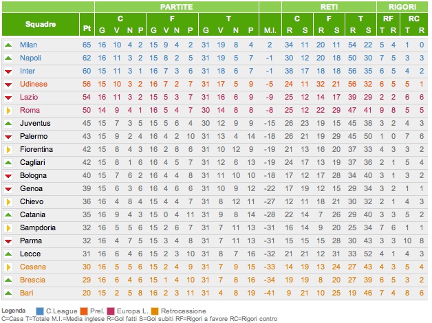Vincono Milan, Roma e Palermo, perde male la Juve in casa, il Bari vince il derby: stasera Inter-Napoli