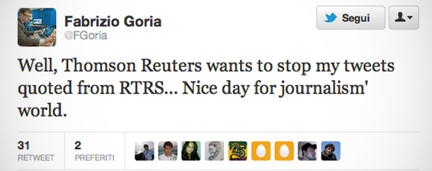 Il caso di Fabrizio Goria, il giornalista a cui Reuters ha chiesto di non diffondere le sue notizie via Twitter