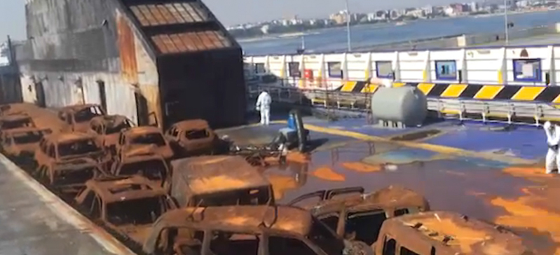Le immagini girate durante la prima ispezione dei tecnici che lavorano all'inchiesta sulla nave distrutta dal grosso incendio lo scorso dicembre, mentre viaggiava tra Grecia e Italia