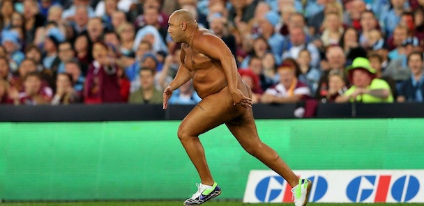 Indossava solo le scarpe, ha superato cartelloni pubblicitari e uomini della sicurezza, ha corso per 95 metri prima di cadere a faccia in giù, e ha guadagnato una grande popolarità