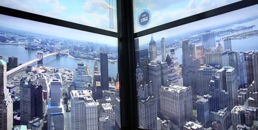 L’ascensore del One World Trade Center ci mette 47 secondi per trasportare i passeggeri dal piano terra al 102esimo piano. Durante il trasporto, su tre pareti della cabina viene proiettato un video in time lapse che mostra l’evoluzione urbanistica di New York, e di come la città è cresciuta in altezza e in densità dal 1500 a oggi.