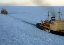 È bloccato con il suo equipaggio di 348 persone nelle acque ghiacciate del Mare di Ochotsk