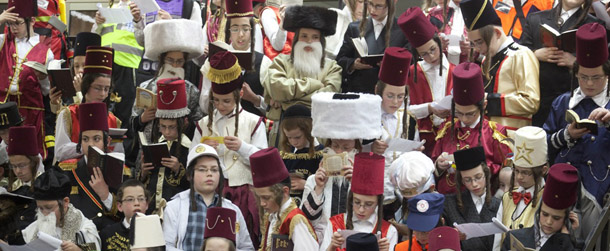 Le foto dei festeggiamenti degli ebrei ortodossi a Bnei Brek, in Israele, tra bambini, barbe finte e scritti sacri