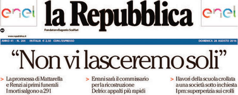 I primi funerali di 35 delle persone morte nel terremoto del Centro Italia sono su tutti i quotidiani