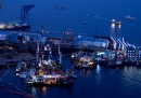 Le prime immagini dell'operazione per riportare la nave in assetto verticale che è finita alle quattro di questa mattina