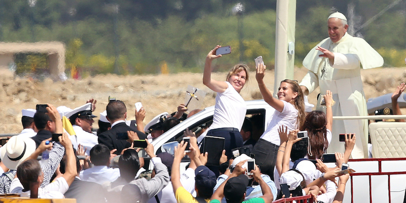 È in Ecuador e poi andrà in Bolivia e in Paraguay, tra accoglienze festose, bandiere, petali di fiori e ovviamente selfie