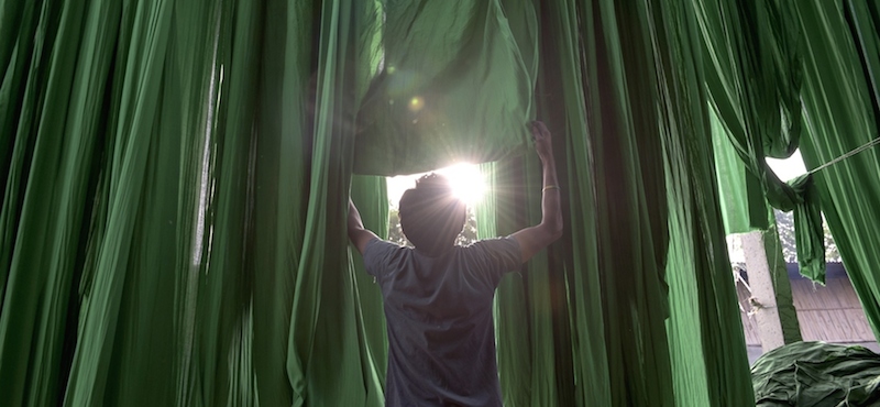 Grandi rastrelliere di legno e lunghi tessuti colorati stesi ad asciugare, nelle fotografie scattate a Sanganer
