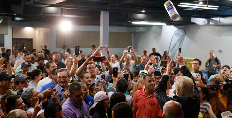 Ha fatto paragoni indelicati tra gli uragani che hanno colpito l'isola e Katrina, si è vantato del suo lavoro e per qualche motivo ha lanciato carta assorbente sulla folla