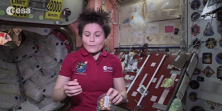 In un video girato a bordo della Stazione Spaziale Internazionale, Samantha Cristoforetti, astronauta dell'Agenzia Spaziale Europea in missione per l'Agenzia Spaziale Italiana, mostra qualche esempio di uno snack sano in assenza di gravità.