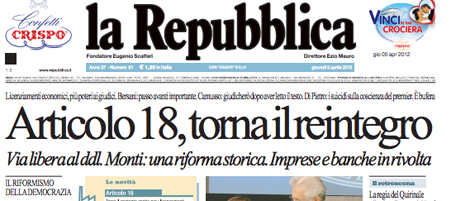 Il titolo di oggi è "torna il reintegro" (e per Libero e Giornale Monti "cala le braghe"), e poi i soldi della Lega ai figli di Bossi