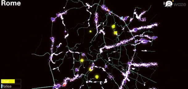 Waze, un servizio di navigazione GPS per cellulari, ha diffuso dei video che mostrano gli spostamenti delle auto a Roma, Parigi e Tel Aviv