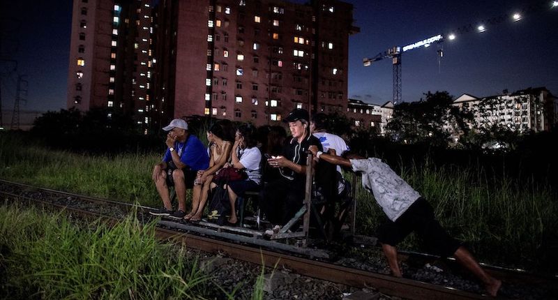 Spingono carretti di fortuna sulle rotaie del treno della capitale delle Filippine, trasportando passeggeri tra un treno e l'altro