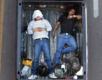 Alejandro Cartagena fotografa dall'alto gli operai dei cantieri edili di Monterrey che viaggiano nel retro dei pick-up dei loro datori di lavoro