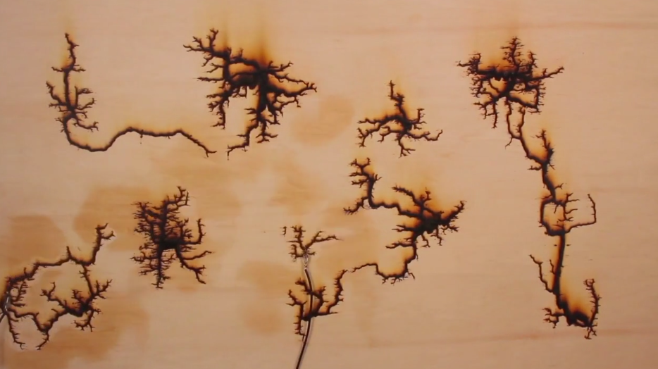 Melanie Hoff ha decorato una tavola di legno attraverso scariche elettriche da 15.000 volt.