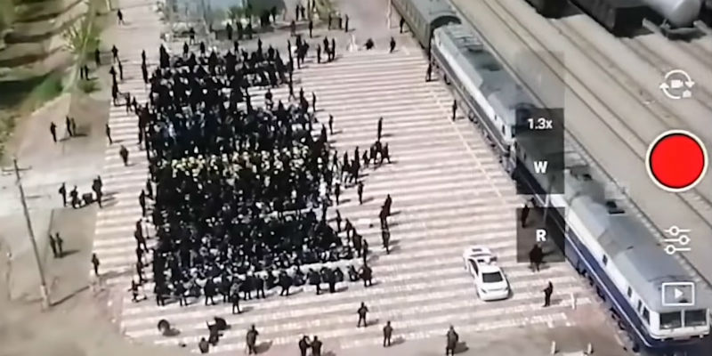 Mostra centinaia di persone, probabilmente musulmani uiguri, legate e bendate in attesa di essere caricate su un treno dalla polizia cinese